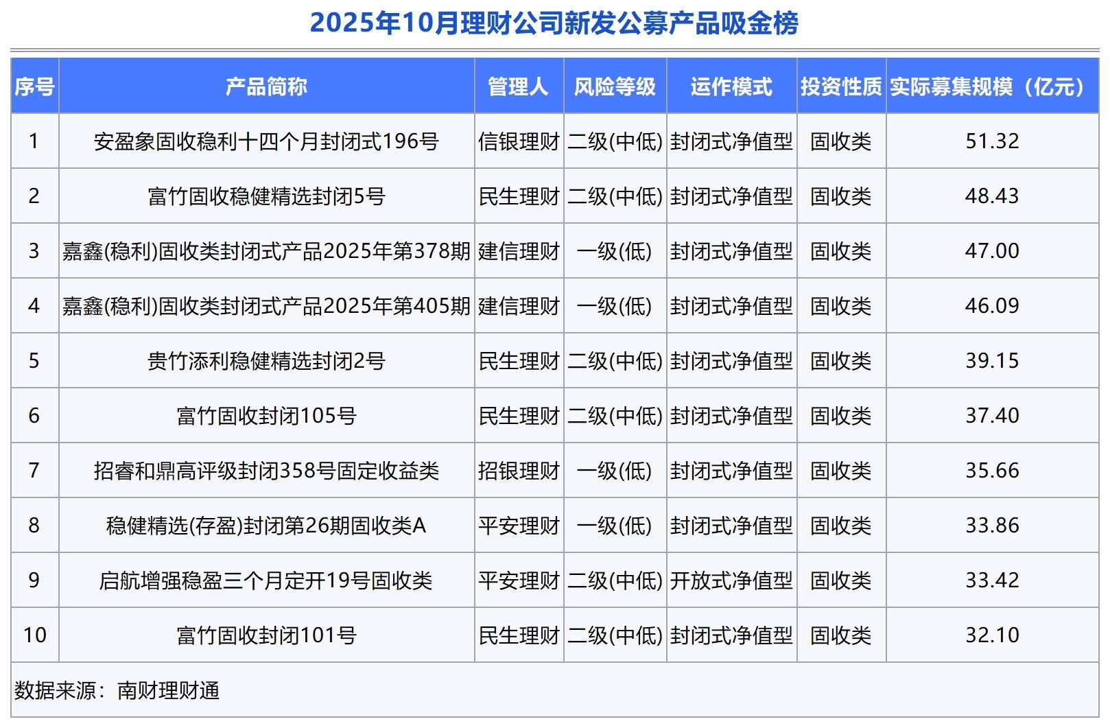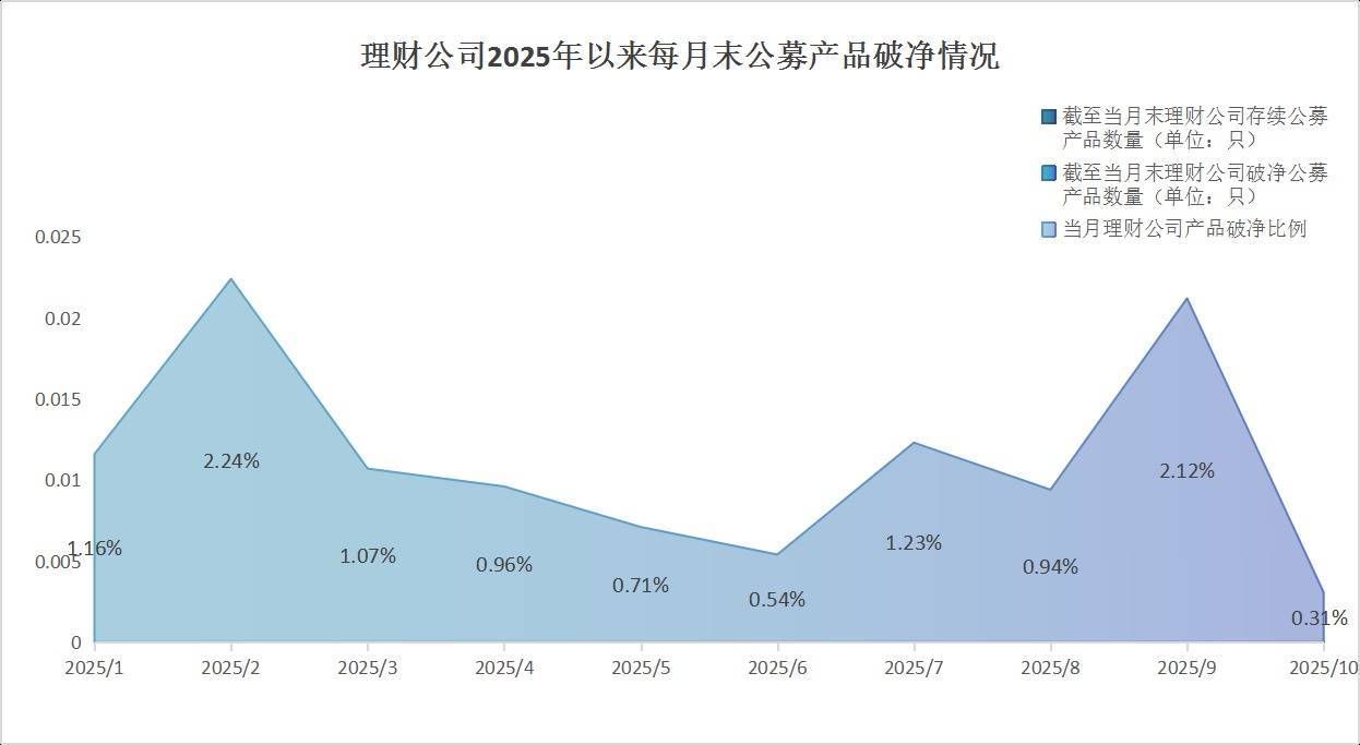 新发情况:2025年10月,在央行重启国债买卖、股债跷跷板效应减弱等因素作用下,债市情绪有所回暖,从而对理财产品募集构成支撑。10月份理财公司产品合计募集资金3005.71亿元,产品募集规模均值为3.18亿元,环比上月的2.25亿元涨超40%。