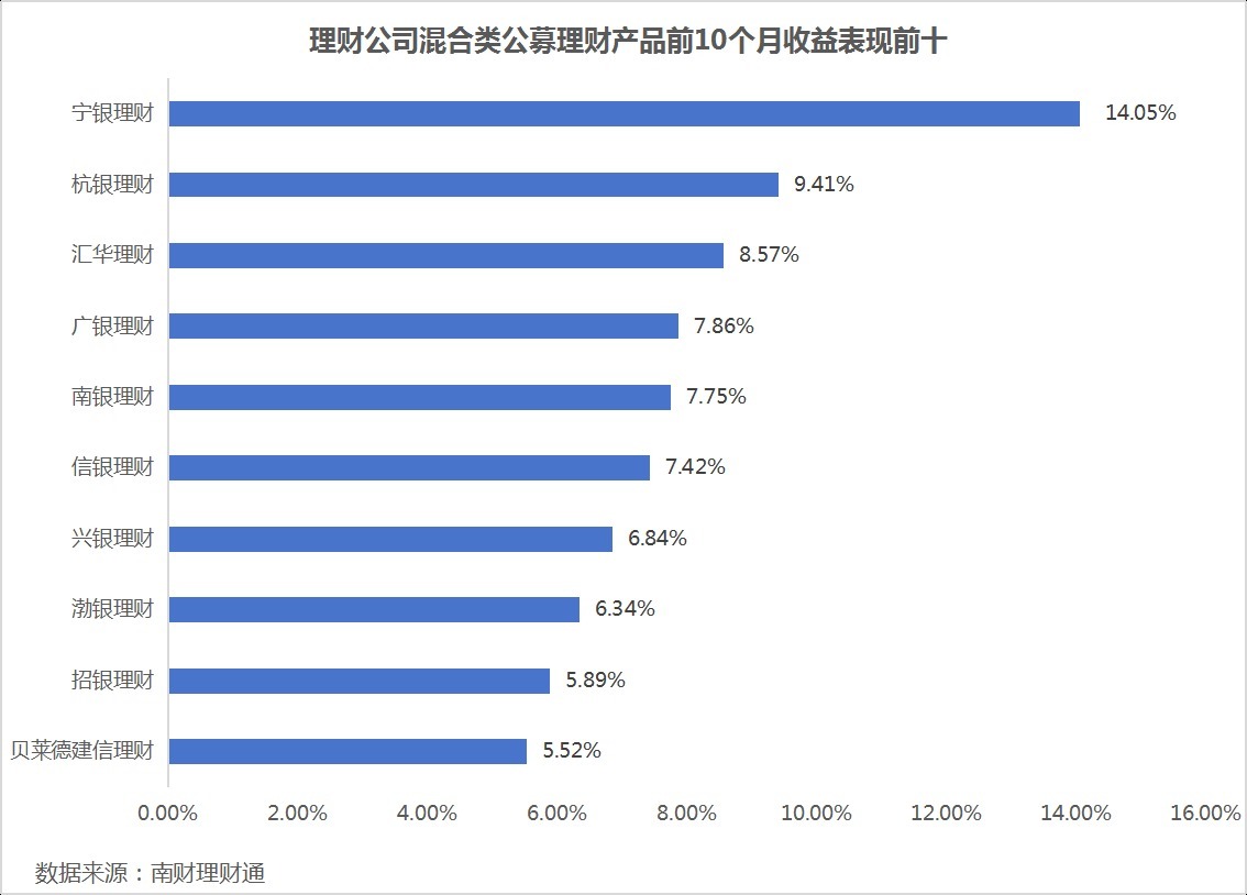 混合类理财产品表现上,宁银理财今年前10个月平均净值增长率最高,达到14.05%;第二名杭银理财平均净值增长率为9.41%;汇华理财以8.57%位列第三。