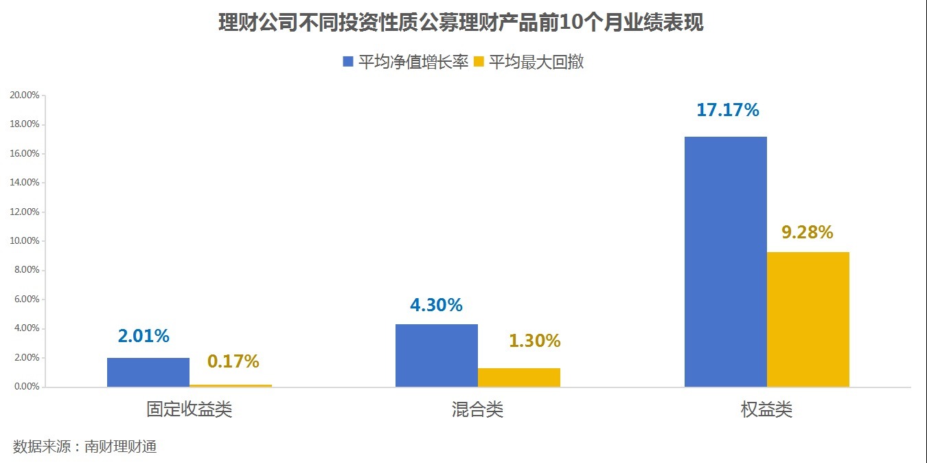 产品回撤方面,固收产品前10个月平均最大回撤为0.17%,权益类理财的平均最大回撤达到9.28%,混合类理财平均最大回撤为1.30%,总体有小幅下降。