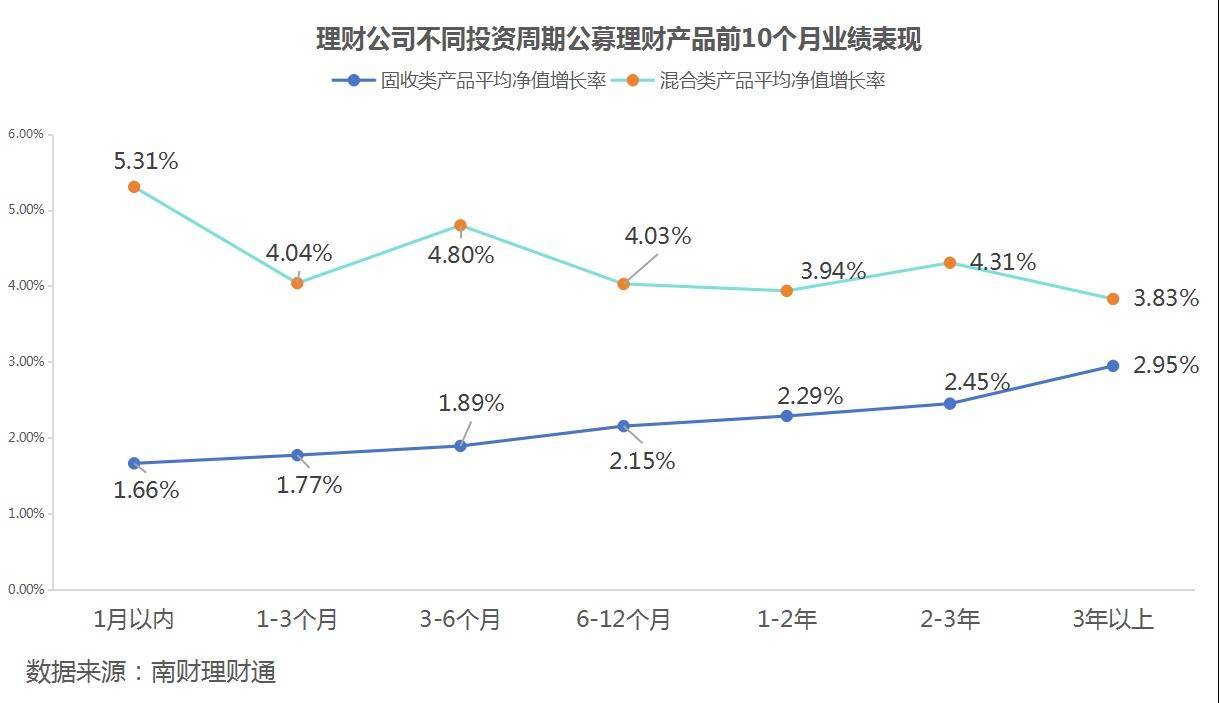 从不同投资周期业绩来看,混合类产品的总体业绩表现均优于同期限固收类产品。1月以内投资周期的混合类产品前10个月平均净值增长率最高,达5.31%。固收类产品总体随着投资周期拉长收益率走高,3年以上投资周期前10个月平均净值增长率达2.95%,1月以内则低至1.66%。