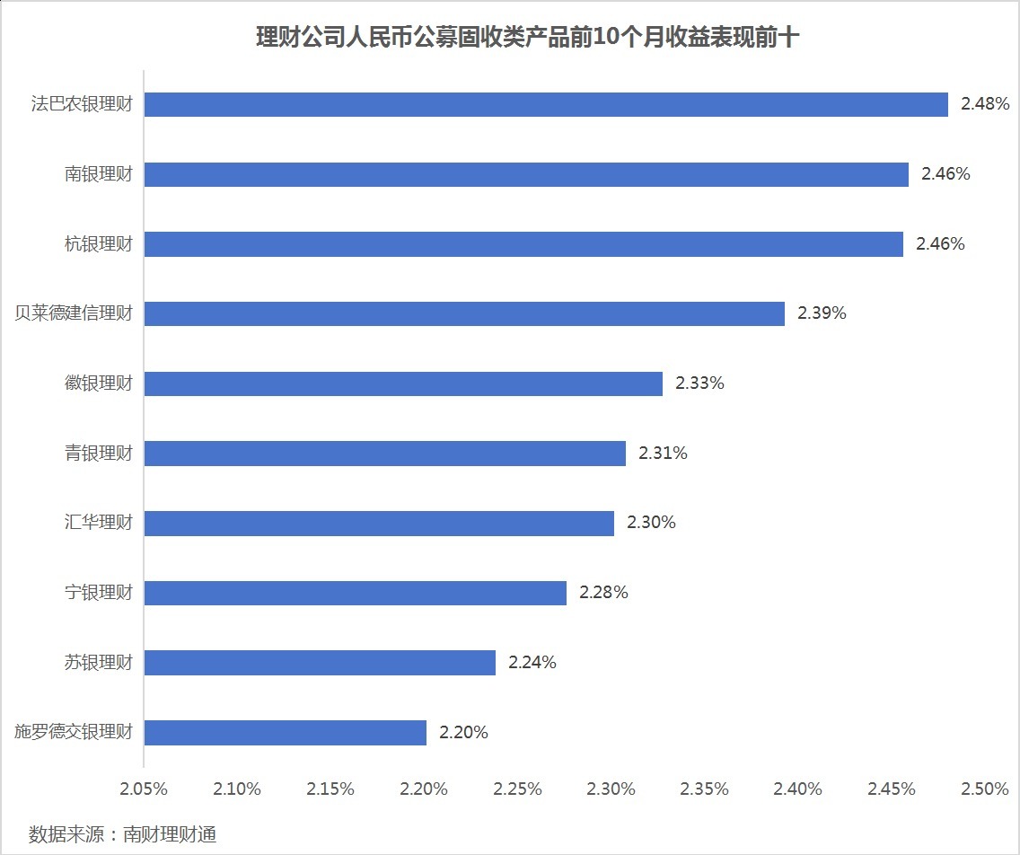 固收类产品收益排名前十的机构中,共有三家合资理财公司,其中施罗德交银理财的收益相对较低,为2.20%。