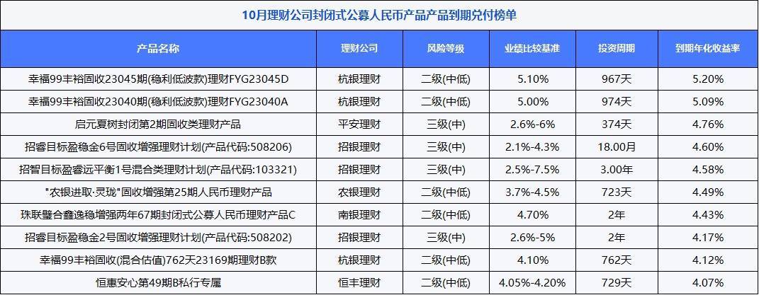 榜单:在10月理财公司封闭式公募理财到期兑付榜单中(注:同系列产品仅取一只,投资币种为人民币),6家理财公司产品上榜,杭银理财、招银理财各上榜3只产品。杭银理财两只固收产品到期年化收益率超5%,位列前二。